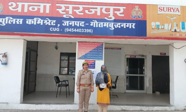 दिनांक 23.03.2026 को थाना सूरजपुर पुलिस द्वारा लोकल इंटेलिजेंस व बीट पुलिसिंग की सहायता से 01 अभियुक्ता अंगूर जान उर्फ सोनी पत्नी राजवीर सिंह चौहान को थाना क्षेत्र के रेलवे लाइन पुल के पास सर्विस रोड़ से गिरफ्तार किया गया है। अभियुक्ता के कब्जे से चोरी के 10,800 रूपये नगद बरामद हुए है।