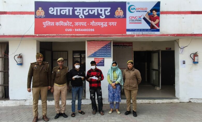 दिनांक 25.12.2025 को थाना सूरजपुर पुलिस व संर्विलांस टीम के संयुक्त प्रयास से थाना सूरजपुर पर पंजीकृत मु0अ0सं0- 728/2025 धारा 2/3 गैगंस्टर एक्ट में वांछित अभियुक्तगण गैंग लीडर 1.बिट्टू उर्फ प्रवेश कसाना पुत्र ज्ञान सिंह निवासी ग्राम भूपखेड़ी थाना लोनी जिला गाजियाबाद उम्र करीब 25 वर्ष व गैंग सदस्य अभियुक्ता 2.सपना पत्नी बिट्टू उर्फ प्रवेश कसाना निवासी उपरोक्त उम्र करीब 26 वर्ष को 130 मीटर रोड़ सेे गिरफ्तार किया गया है। अभियुक्त बिट्टू उर्फ प्रवेश कसाना उपरोक्त के कब्जे से अवैध तमंचा .315 बोर व 01 जिंदा कारतूस मौके पर बरामद किया गया है। जिसके सम्बन्ध में थाना सूरजपुर पर मु0अ0सं0 735/2025 धारा 3/25 आर्म्स एक्ट पंजीकृत किया गया है तथा इनके साथी शिवम कसाना पुत्र बिट्टू उर्फ प्रवेश कसाना निवासी ग्राम भूपखेड़ी थाना लोनी जनपद गाजियाबाद उम्र करीब 22 वर्ष को दिनांक 24.12.2025 की रात्रि में मिग्सन विलासा गोलचक्कर के पास सेे गिरफ्तार किया गया था जिसके कब्जे से 01 अवैध तमंचा .315 बोर मय 01 जिंदा कारतूस .315 बोर बरामद किया गया है अवैध शस्त्र बरामदगी के सम्बन्ध में थाना सूरजपुर पर मु0अ0सं0- 734/2025 धारा 3/25 आर्म्स एक्ट थाना सूरजपुर पंजीकृत किया गया है।
