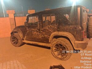 चालक घायल 10 किलोमीटर तक थार कार से घसीट ता ले गया थार चालक बादलपुर दादरी कोट पुलिस व जारचा पुलिस ने 10 किलोमीटर तक पीछा कर थार को पकडा जप्त रास्ते में
