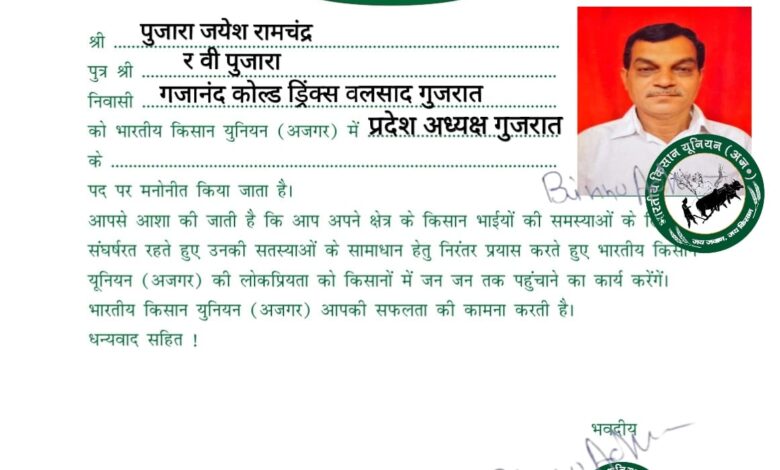 भारतीय किसान यूनियन अजगर के युवा राष्ट्रीय अध्यक्ष श्री बिन्नू अधाना जी के द्वारा श्री पुजारा जयेश रामचंद्र पुत्र श्री र वी पुजारा जी को