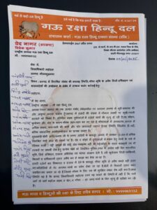6. यदि प्रशासन गायों के संरक्षण एवं गौचर भूमि उपलब्ध कराने में पूर्णतः असमर्थ है, तो यह स्थिति स्पष्ट रूप से मुख्यमंत्री योगी जी व शासन को लिखित में तत्काल अवगत कराई जाए वेद नागर ने कहा इस प्रकार गोवंश को सड़कों पर मरने के लिए छोड़ देना अमानवीय और असंवैधानिक अत्याचार है।यदि शीघ्र ठोस कार्रवाई नहीं की गई, तो गौ रक्षा हिन्दू दल को लोकतांत्रिक एवं वैधानिक तरीके से व्यापक जनआंदोलन के लिए बाध्य होना पड़ेगा,जिसकी सम्पूर्ण जिम्मेदारी जिला प्रशासन की होगी।