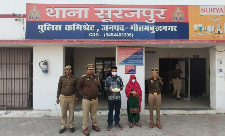 दिनांक- 23.02.2026 को थाना सूरजपुर क्षेत्रान्तर्गत ग्राम देवला में एक व्यक्ति विजय पुत्र किशन पाल निवासी ग्राम बेलोन थाना नरौरा जनपद बुलन्दशहर उम्र करीब 30 वर्ष मृत अवस्था में मिलने की सूचना पर थाना स्थाननीय पुलिस द्वारा मौके पर जाकर जाँच की गयी तो आरोपी राखी व गुरदीप का पिछले 3-4 साल से प्रेम प्रंसग चल रहा है पूर्व में भी राखी अपने प्रेमी गुरदीप उपरोक्त के साथ चली गयी थी और करीब 01 वर्ष तक गुरदीप के साथ रही। करीब 15 दिन पहले मृतक विजय जो नोवा कूलर कम्पनी में मजदूरी करता है को गांव बेलोन बुलन्दशहर से लेकर देवला में आ गयी थी। मृतक विजय आरोपी राखी व गुरदीप के प्रेम प्रसंग में बाधा उत्पन्न कर रहा था जिसके चलते विजय की पत्नी राखी व उसके प्रेमी गुरदीप ने मिलकर विजय के गले में चुन्नी से फंदा लगाकर हत्या कर दी है जिसके सम्बन्ध में थाना सूरजपुर पर मु0अ0सं0- 109/2026 धारा 103(1) बीएनएस पंजीकृत कर दोनो आरोपियो को आज दिनांक 24.02.2026 को मोजर बीयर गोलचक्कर के पास से गिरफ्तार किया गया है।